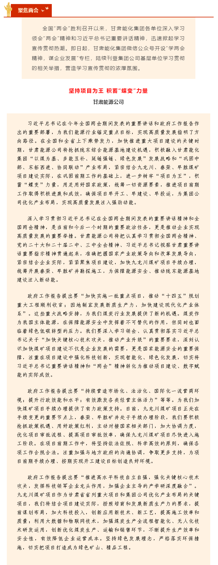学两会精神 谋企业生长 | 甘肃能源公司坚持项目为王 积贮“蝶变”力量