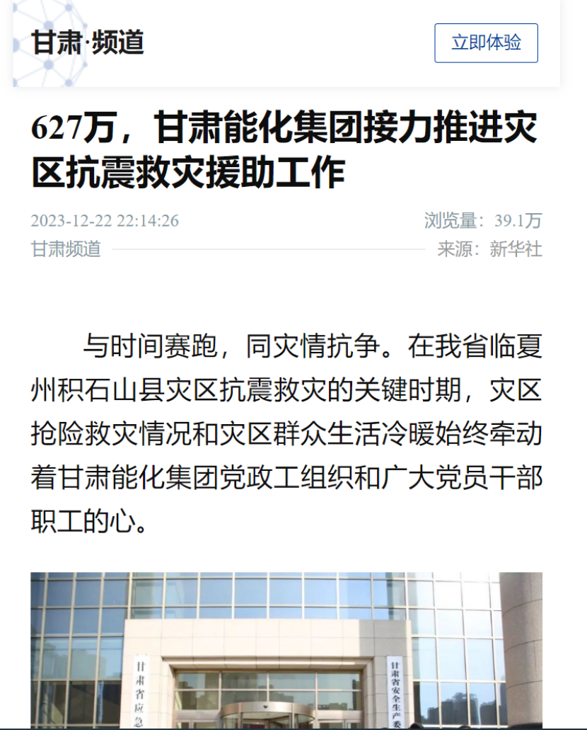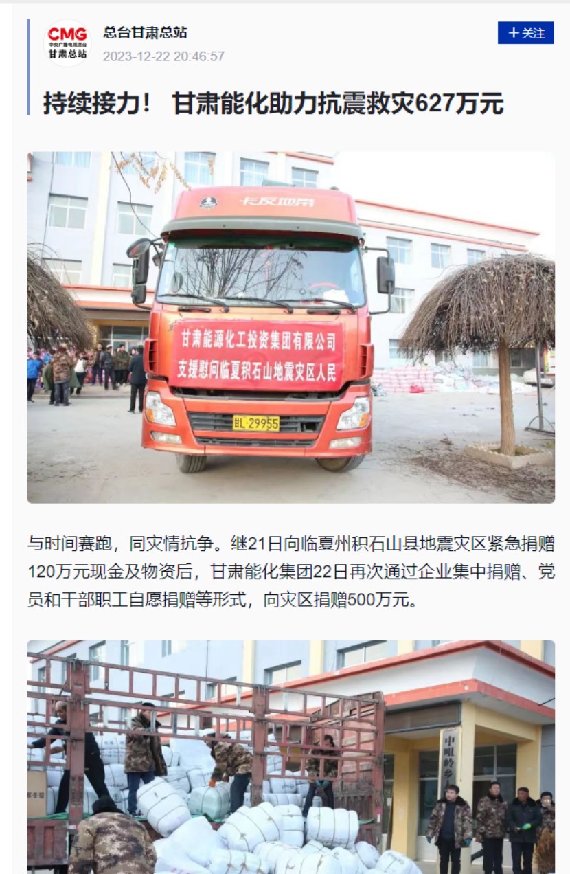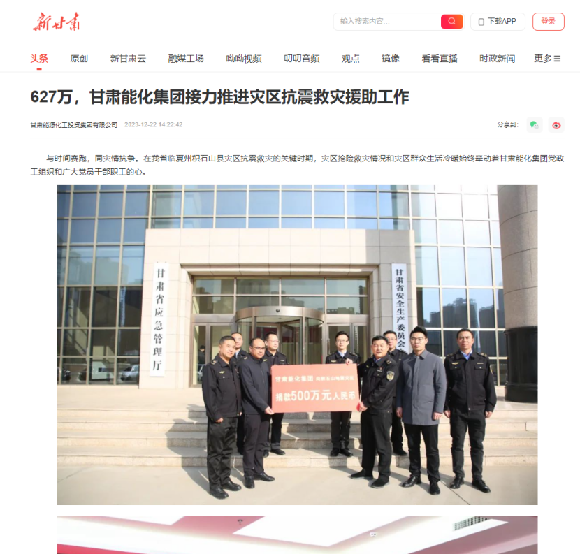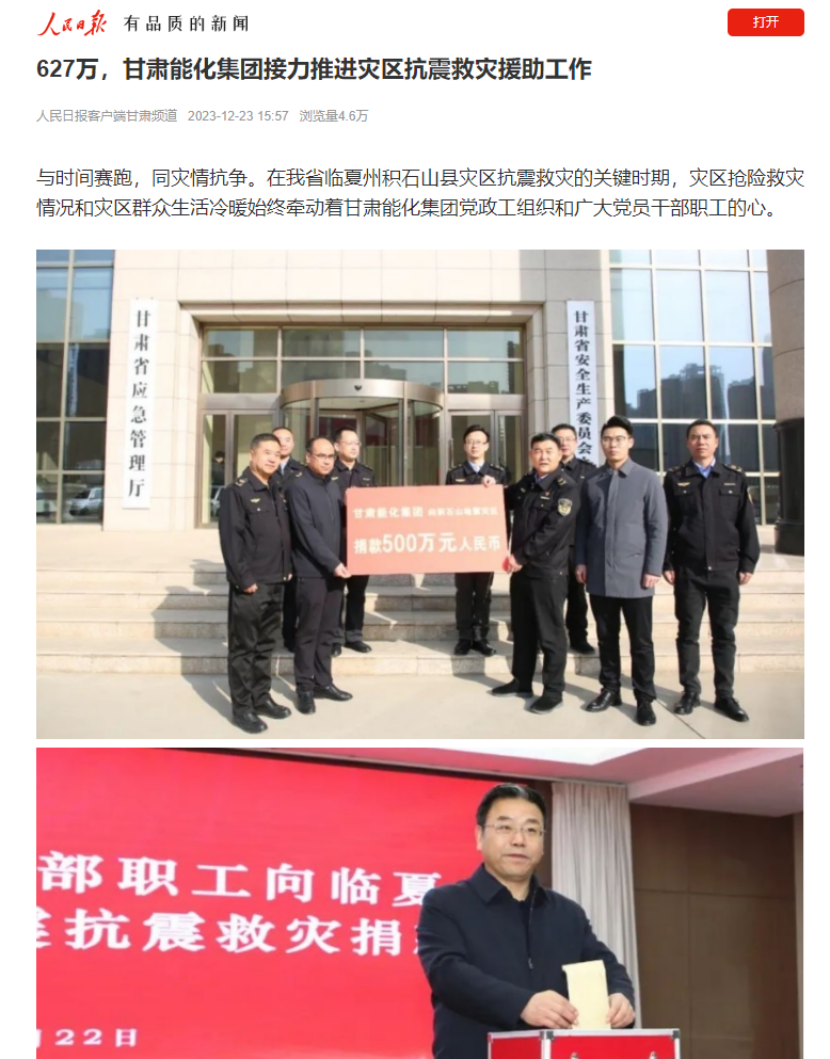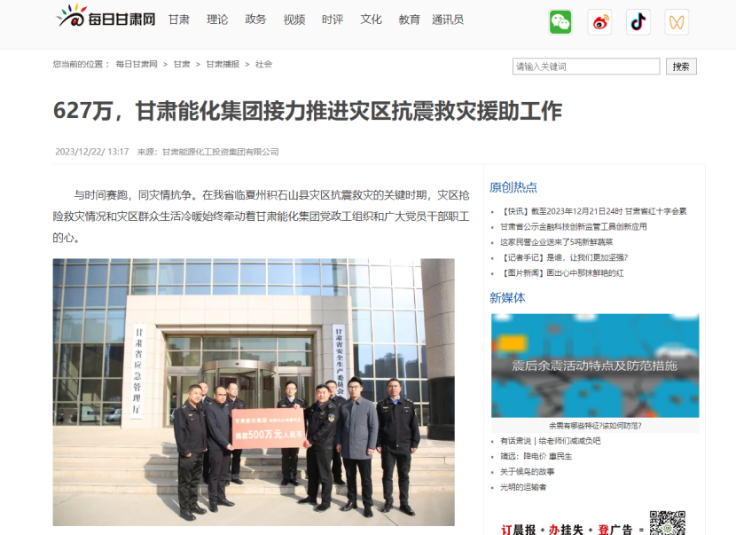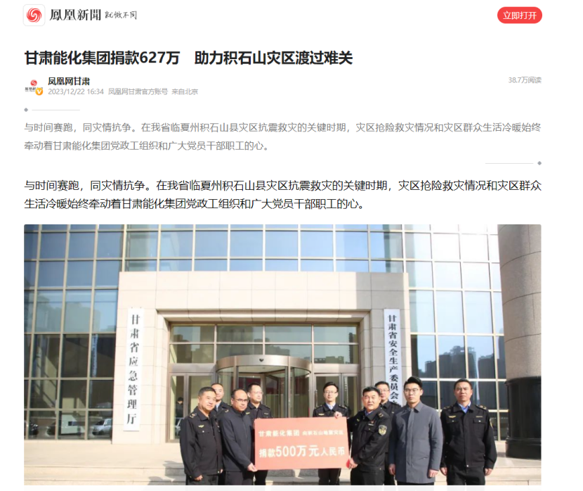 阻止现在,《ag亚洲集团网集团捐赠120万元现金及物资支持灾区抗震救灾事情》《627万,ag亚洲集团网集团接力推进灾区抗震救灾援助事情》划分在新华社客户端、人民日报客户端、央视新闻、凤凰网、新甘肃、视听甘肃、逐日甘肃网、中国煤炭工业杂志、甘肃国资平台转载刊登,共计12条。总浏览量117.2万,其中,新华社客户端浏览量37.6万,人民日报客户端浏览量4.5万,凤凰网浏览量74.6万。