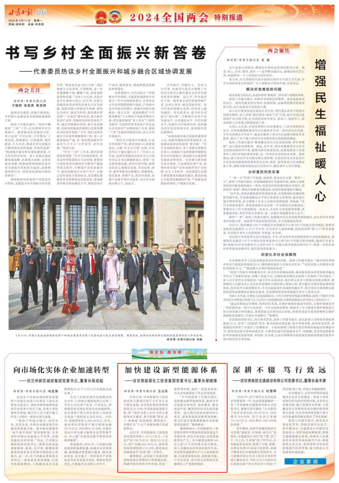 开春以来,甘肃能源化工投资集团加力推进庆阳宁正矿区九龙川煤炭基地、金昌低阶煤高效使用制氢及50万吨/年高浓度尿基复合肥、第三批沙戈荒1.9GW光伏大基地等项目建设,着力构建“煤电、化工、新能源、投资融资、勘探设计、非煤矿业”六大工业板块耦合生长新名堂。2023年,甘肃能源化工投资集团实现营业收入167.57亿元、工业总产值139.79亿元、利润20.56亿元、资产总额484.33亿元,国有资源保值增值率110.12%,获省属企业绩效评价“优异”第一名等次。谢晓锋说,这得益于省委省政府将招商引资摆到空前主要位置,构建开放共享的合作情形,营造一流营商情形,提供一流服务包管,为企业生长创立了优良情形气氛。“今年的政府事情报告指出,加速建设新型能源系统,推动漫衍式能源开发使用,施展煤炭、煤电兜底作用,确保经济社会生长用能需求。这让我们加速生长的信心更足,谋划生长的思绪越发清晰,起劲打造甘肃能源旗舰企业的愿望越发强烈。”谢晓锋说。谢晓锋体现,甘肃能源化工投资集团将牢牢掌握高质量生长这个主要使命,团结自身现实,加速生长新质生产力。全力推进总投资466亿元的11个省列重大项目建设。深入实验国企刷新深化提升行动,在培育生长新质生产力上取得新突破,打造质量效益高、立异能力强、工业结构优、活力动力足的现代化能源化工工业投资集团。