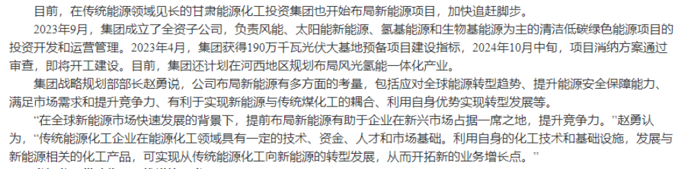 2023Äê9Ô£¬¼¯ÍލÉèÁËÈ«×Ê×Ó¹«Ë¾£¬ÈÏÕæ·çÄÜ¡¢Ì«ÑôÄÜÐÂÄÜÔ´¡¢Çâ»ùÄÜÔ´ºÍÉúÎï»ùÄÜԴΪÖ÷µÄÇå½àµÍ̼ÂÌÉ«ÄÜÔ´ÏîÄ¿µÄͶ×Ê¿ª·¢ºÍÔËÓª¹ÜÀí¡£2023Äê4Ô£¬¼¯ÍÅ»ñµÃ190ÍòǧÍß¹â·ü´ó»ùµØ×¼±¸ÏîÄ¿½¨ÉèÖ¸±ê£¬2024Äê10ÔÂÖÐÑ®£¬ÏîÄ¿ÏûÄɼƻ®Í¨¹ýÉó²é£¬¼´½«¿ª¹¤½¨Éè¡£ÏÖÔÚ£¬¼¯ÍÅ»¹ÍýÏëÔÚºÓÎ÷µØÇøÍýÏë½á¹¹¾°ÎïÇâÄÜÒ»Ì廯¹¤Òµ¡£