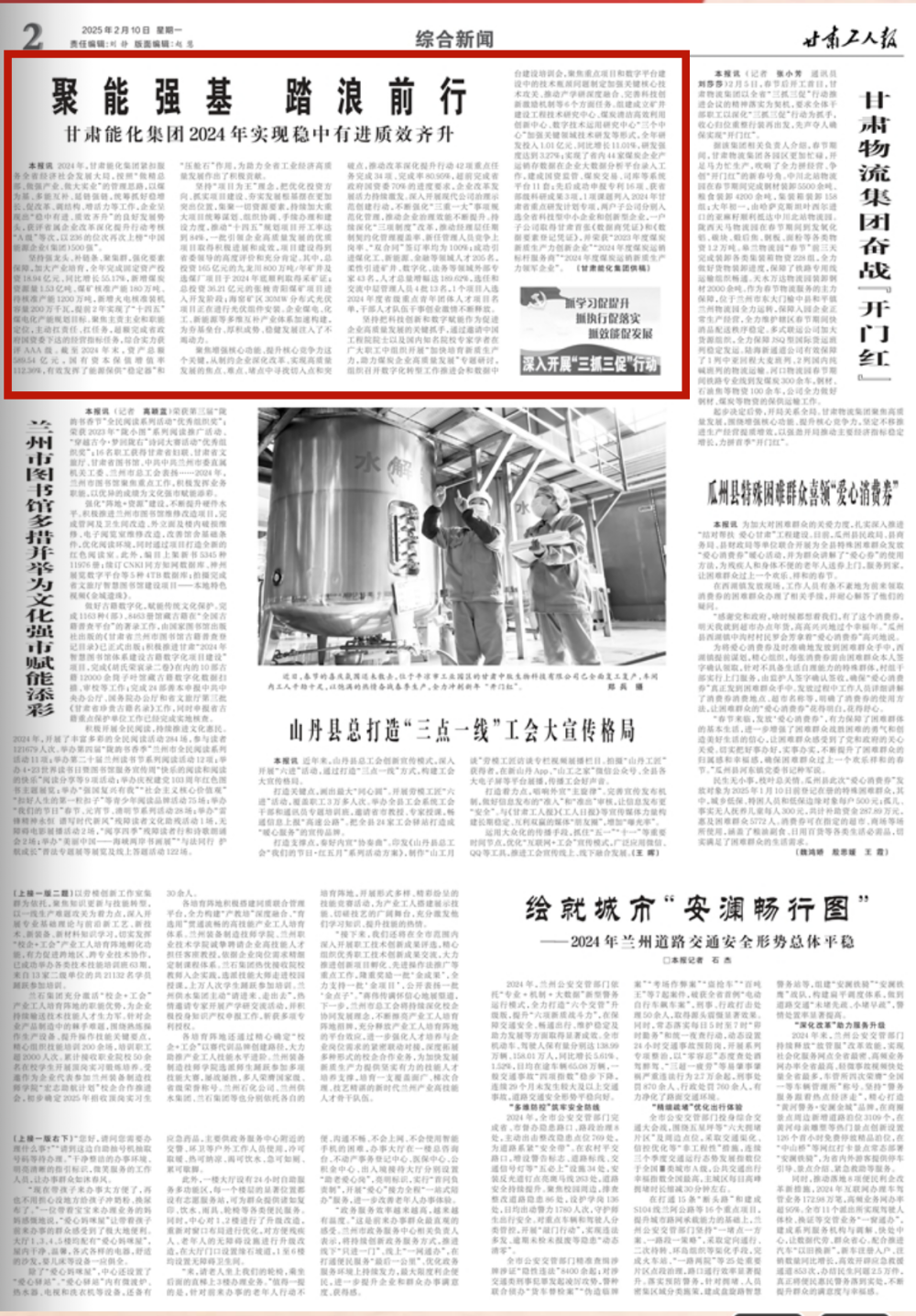 2月10日,甘肃工人报刊登了《聚能强基 踏浪前行——ag亚洲集团网集团2024年实现稳中有进质效齐升》文章。
