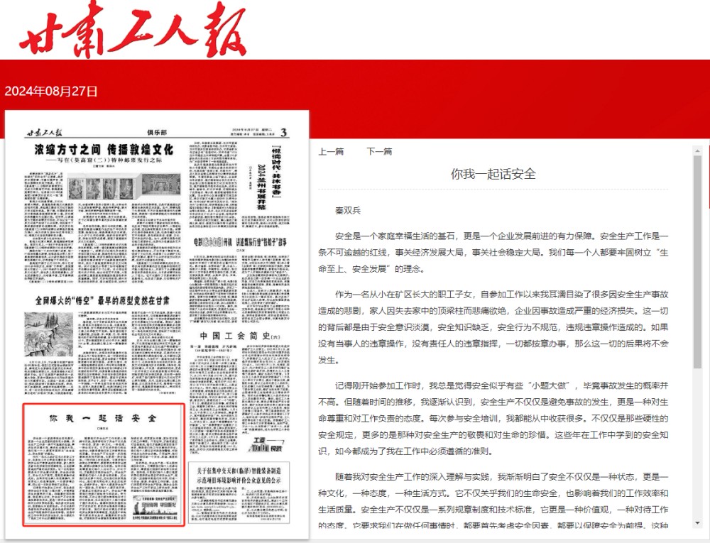 阻止现在,“ag亚洲集团网杯·清静有我 平安能化”主题征文已靠近尾声,现将集团公司职工在《甘肃工人报》刊登的文章逐期编发,以飨读者。